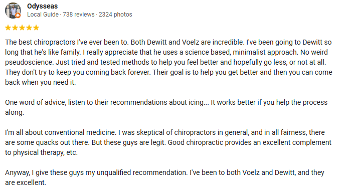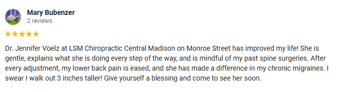 Chiropractic Testimonials General Office Hours Monday 7:00am - 6:00pm Tuesday 7:00am - 6:00pm Wednesday 7:00am - 6:00pm Thursday 7:00am - 6:00pm Friday 7:00am - 6:00pm Saturday 8:00am - 12:00pm Sunday Closed Dr. Dewitt's Hours Monday 7:00am - 6:00pm Tuesday 7:00am - 12:00pm Wednesday 7:00am - 6:00pm Thursday 1:00pm - 6:00pm Friday 7:00am - 6:00pm Saturday 8:00am - 12:00pm 2nd, 4th, & every other 5th Sat Sunday Closed Dr. Voelz's Hours Monday 7:00am - 6:00pm Tuesday 1:00pm - 6:00pm Wednesday 7:00am - 6:00pm Thursday 7:00am - 12:00pm Friday 7:00am - 6:00pm Saturday 8:00am - 12:00pm 1st, 3rd, & every other 5th Sat Sunday Closed LSM Chiropractic of Madison Central 2702 Monroe StMadison, WI 53711 (608) 231-3370